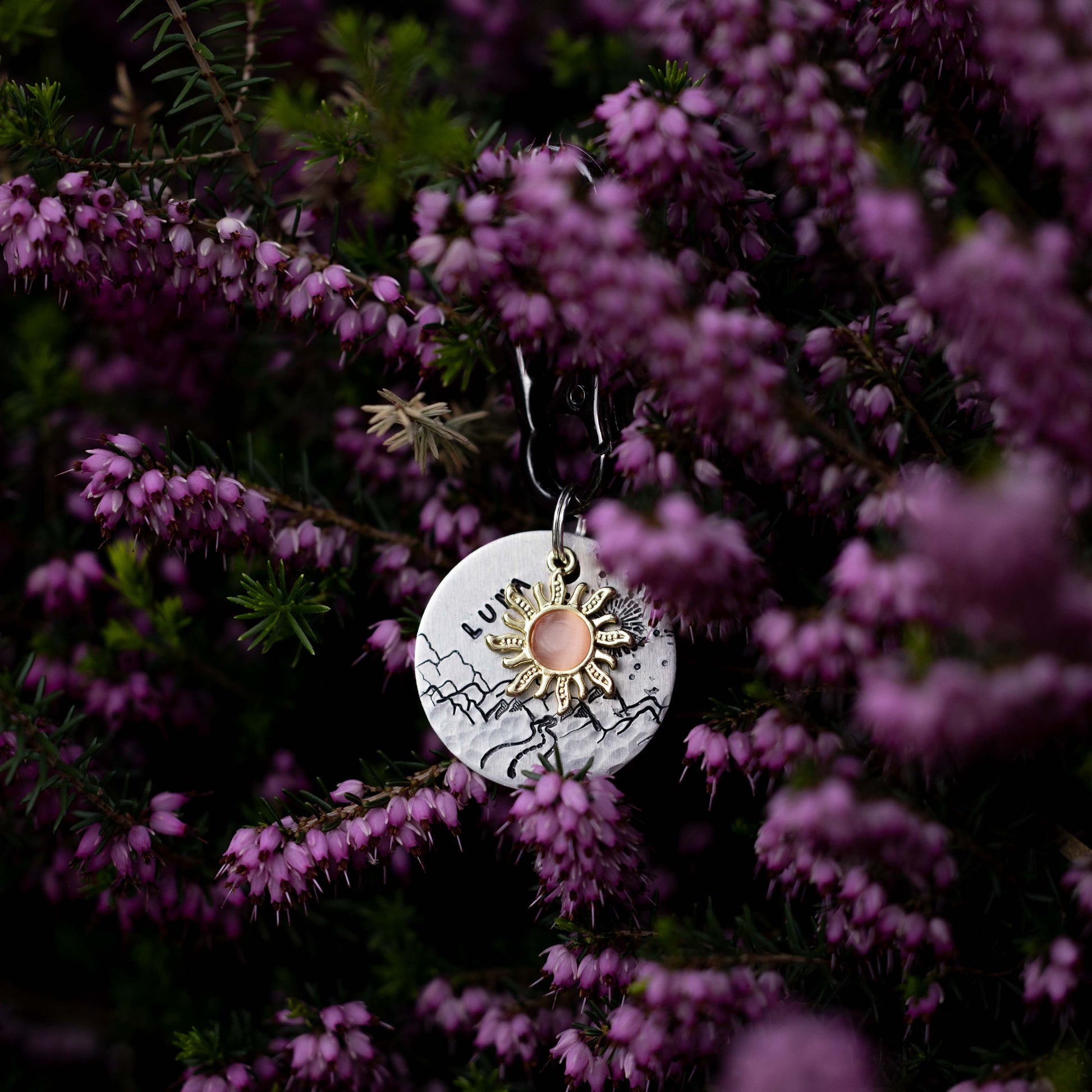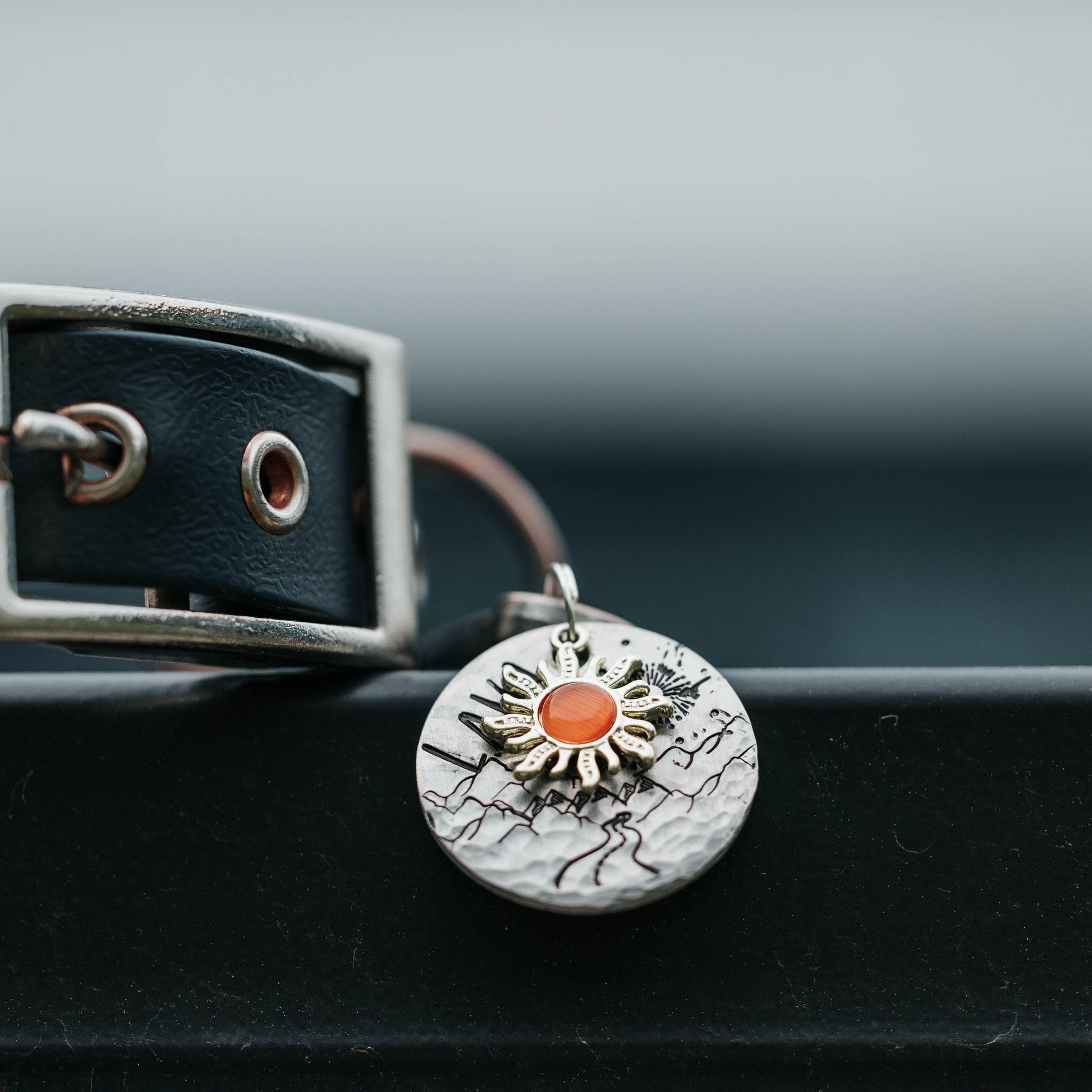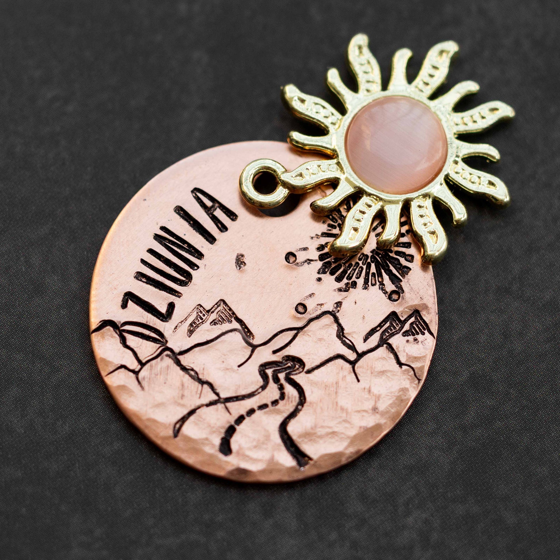 Zawieszka słońce w kolorze złotym z pomarańczowym środkiem.