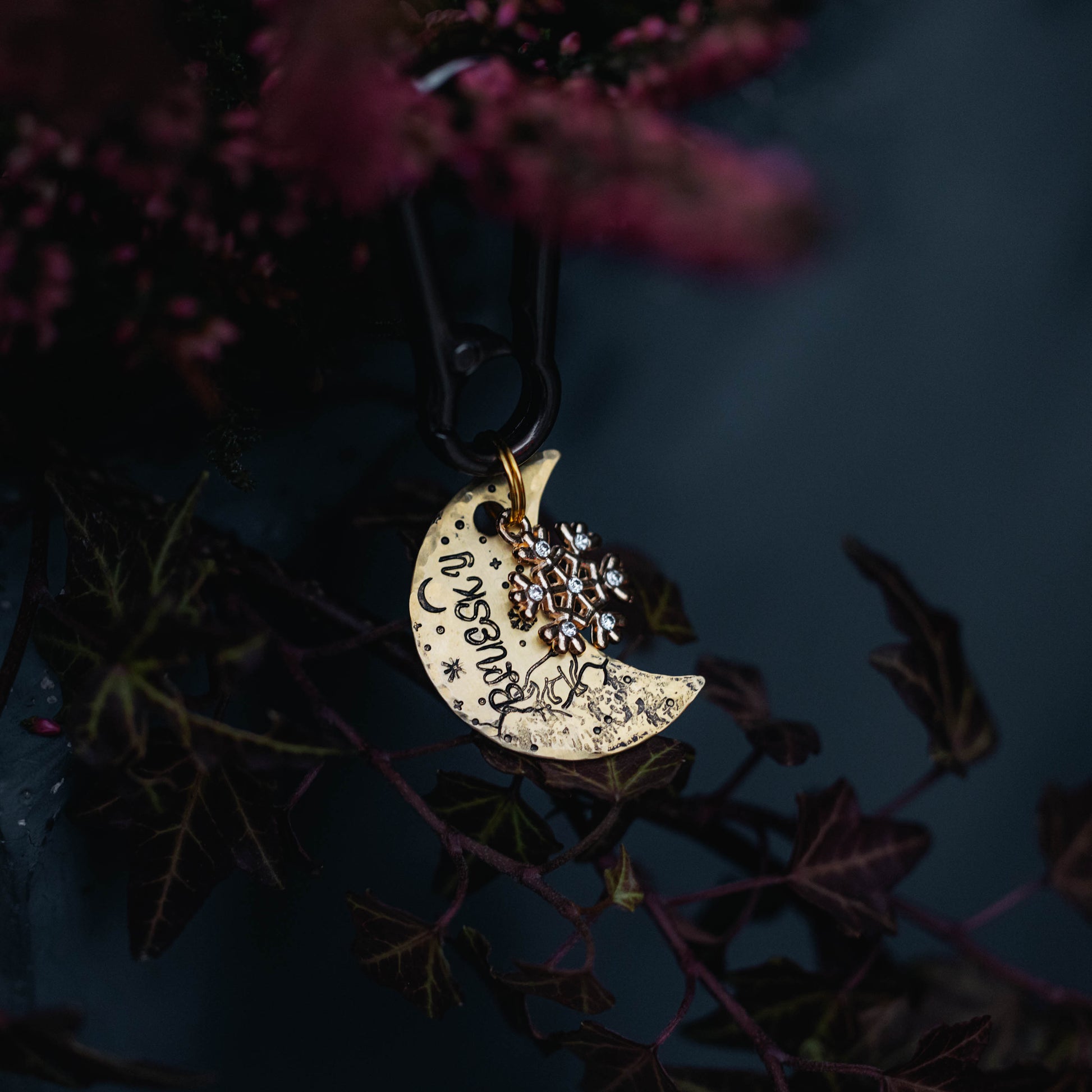 Do wzoru HOWN MOON dołączona jest zawieszka błyszczącej śnieżynki. Zawieszka, niezależnie od wyboru koloru blaszki księżyca, pozostaje w kolorze złotym.